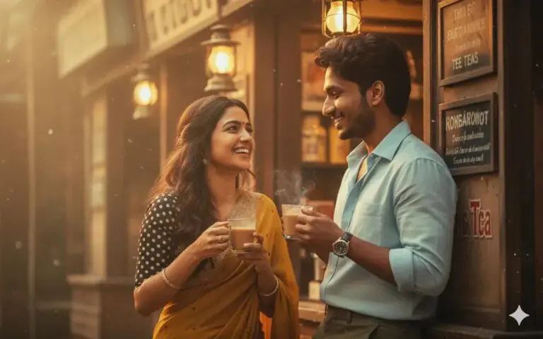 Prompt-New couple Photo prompts is hereAn intimate editorial-style shot of a couple outside a vintage tea shop with old signboards and dim lantern lights. Both are holding hot tea glasses, laughing and chatting as if caught in a candid moment. The girl (uploaded girl face) wears a retro saree in mustard yellow with a polka-dot blouse, her wavy curls glowing in soft light. The guy (your face) leans casually againstthe shopfront in a pastel shirt, smiling at her. 1/2
