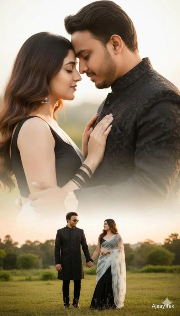 Prompt-A hyper-realistic 8K cinematic DSLR double exposure portrait of a couple. Use the exact faces from the reference photo, do not alter their faces in any way. The primary close-up shows the couple forehead to forehead, eyes closed, in a soft romantic embrace. The man has a beard and wears a black patterned sherwani jacket, while the woman wears a black outfit with elegant bangles. Her hand rests on his chest, highlighting a wristwatch. The secondary exposure shows both of themstanding #couple