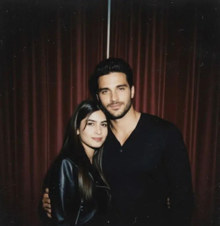 Prompt-Take a photo taken with a Polaroid camera. The photo should look like an ordinary photograph, without an explicit subject or property. The photo should have a slight blur and a consistent light source, like a flash from a dark room, scattered throughout the photo. Don’t change the face. Change the background behind those two people with white curtains. With that boy and me make a cute poses.