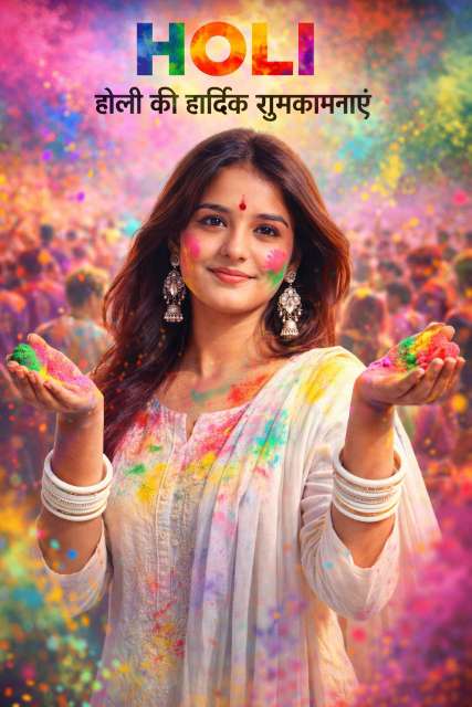 Use my selfie as the exact face. 2:3 ultra-real Holi photo of a young Indian girl, camera-facing. White suit with dupatta, light red/yellow/green/blue color marks, earrings, white bangles, small red tilak, light gulal on cheeks and hands, both hands slightly raised with color.Festive Holi crowd background with flying colors, top gulal clouds, mid blur, foreground color dust blur for depth. Add bold multicolor text “HOLI” at top and “होली की हार्दिक शुभकामनाएं” just below it. Neon vibrant grading, high contrast, soft glow, studio light, 4K, Instagram poster look.